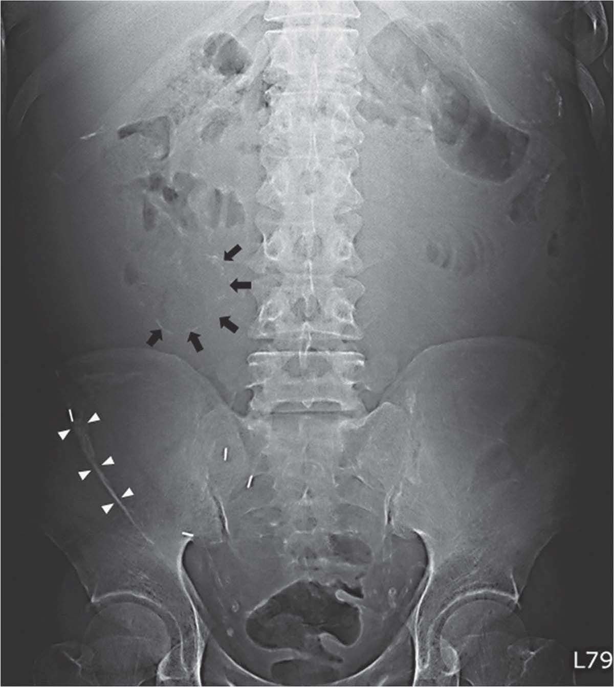 revealed normal blood leukocyte count (WBC: 7,100/mm3 ) but an elevated C-reactive protein level (50.3 mg/l). An abdominal radiograph was obtained to evaluate his symptoms. The intestinal wall was outlined by continuous calcifications (Figure 1 , arrows), and the curvilinear calcification on the right side of the radiograph was peritoneal calcification (Figure 1, white arrows). A contrast enhanced