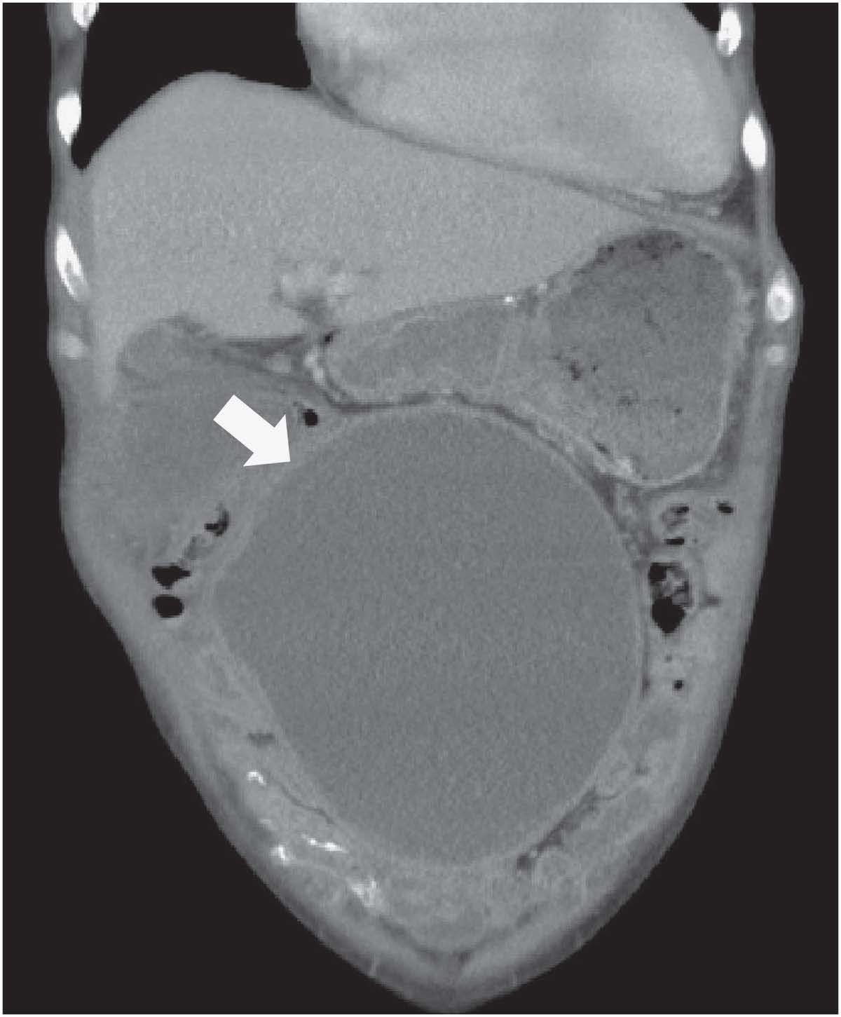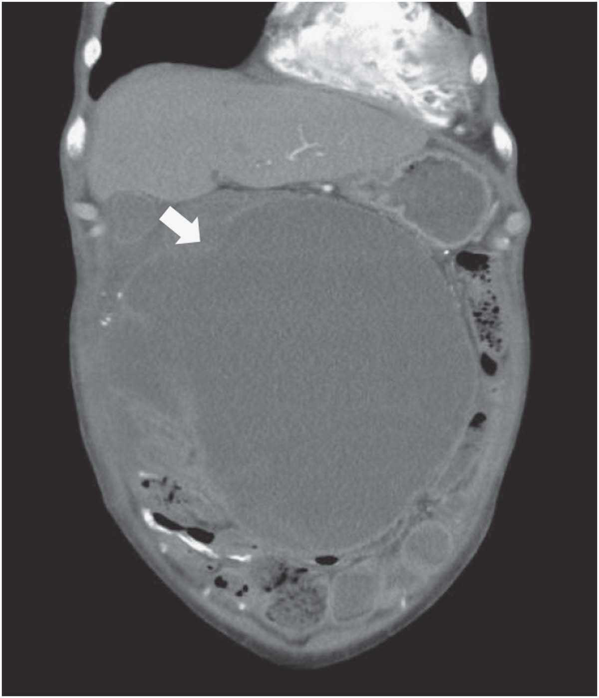 ......A 45-year-old man with a medical history of end-stage renal disease was admitted owing to abdominal fullness, vomiting, and poor appetite for 1 month. The patient had received 13 years of PD followed by removal of the PD catheter owing to refractory peritonitis, resulting in a shift to hemodialysis 2 months before this admission. A physical examination showed a body temperature of 36.5 °C, a