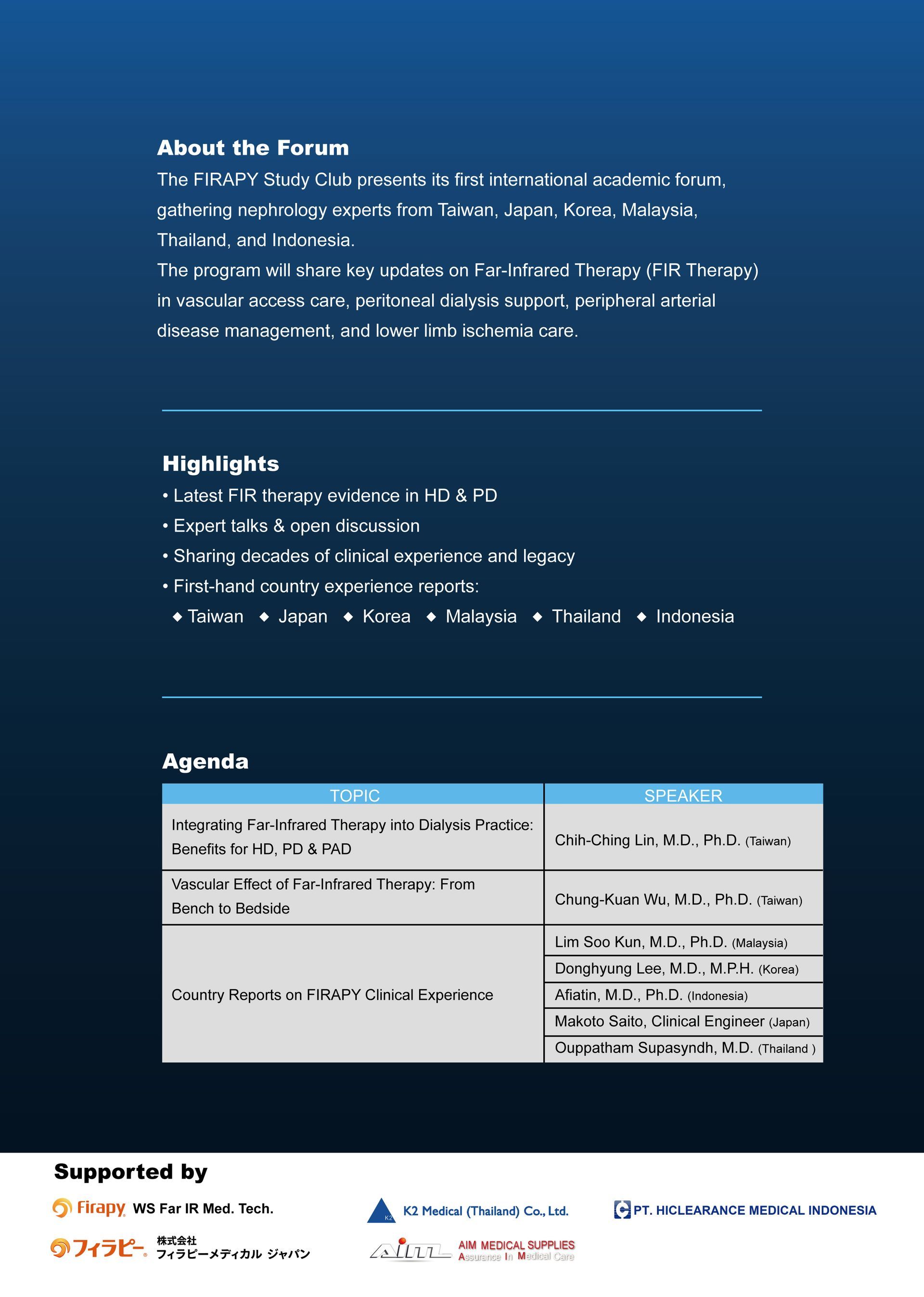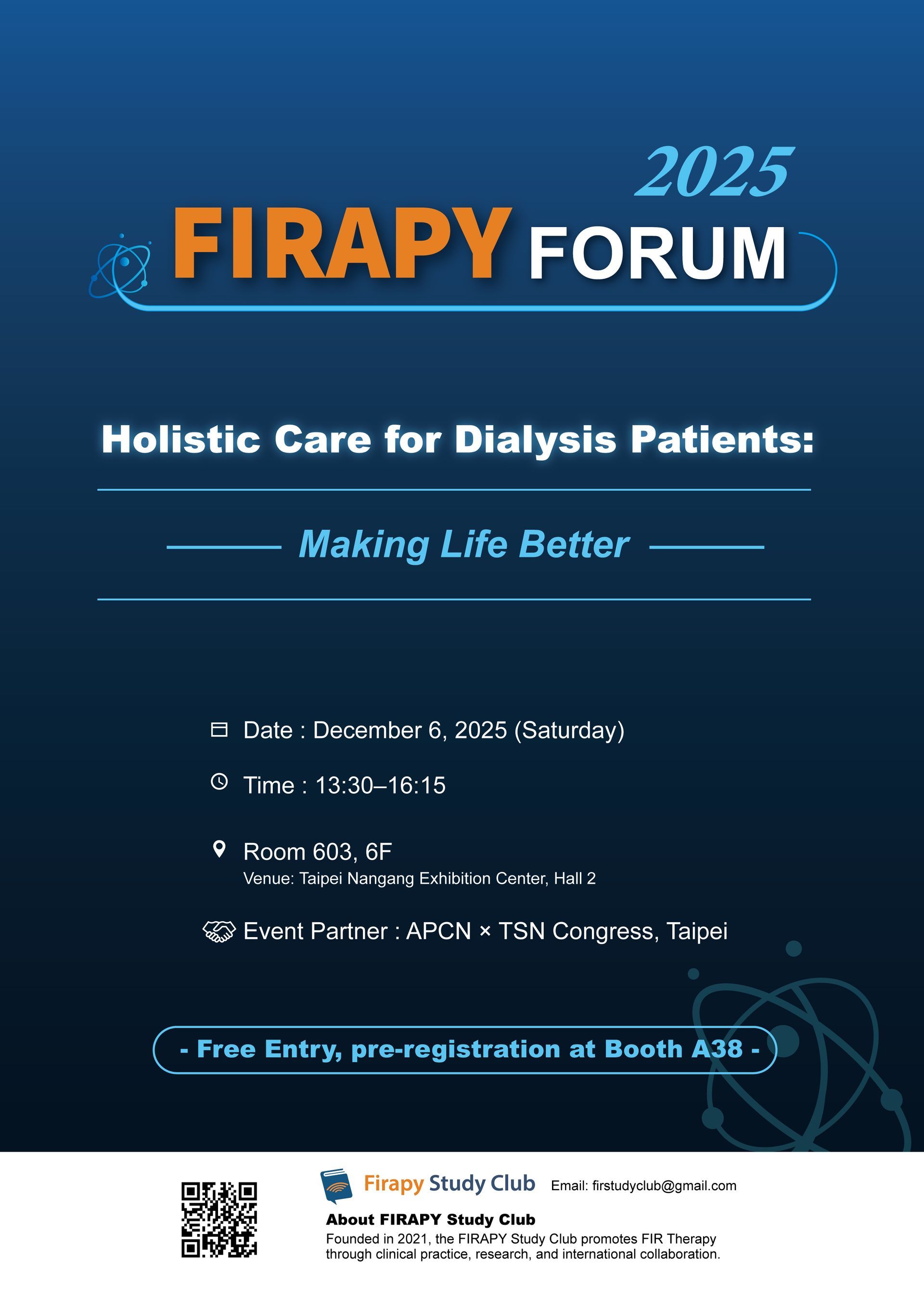 Under the theme “Holistic Care for Dialysis Patients: Makes Life Better,” the Forum will bring together nephrology experts from Taiwan, Japan, Korea, Malaysia, Thailand, and Indonesia to share the latest scientific evidence and real-world experience in far-infrared therapy (FIR therapy) for dialysis patients—covering vascular access care, dialysis management, and long-term outcome improvement.