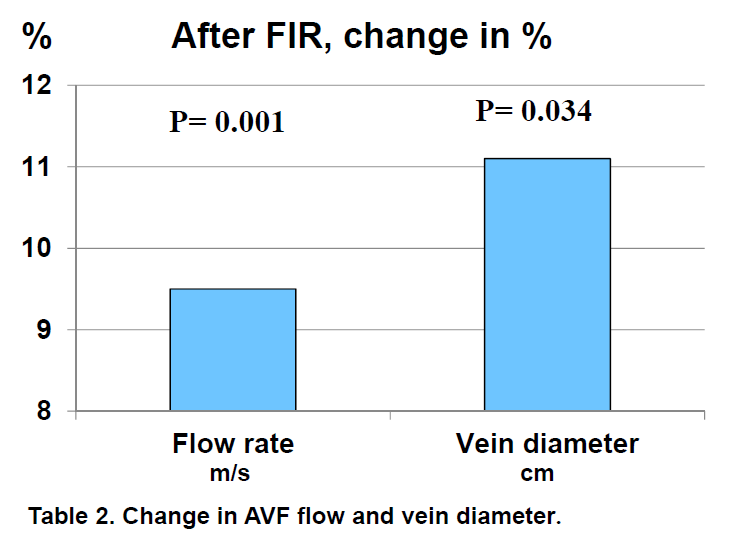 Results: The AVF flow rate increased after one FIR treatment, mean 2.1±1 m/s to 2.3±1, (p=0.001).